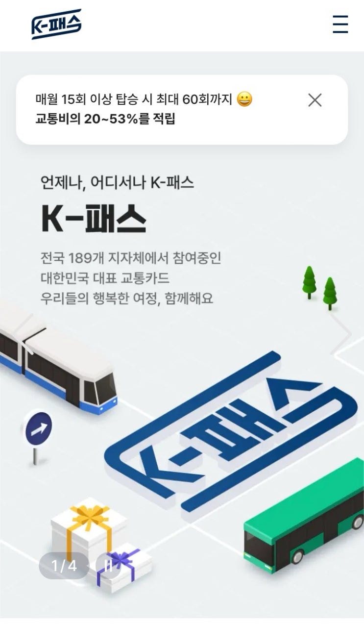 24.5.1 부터 시행된 K-패스 사업 국가 교통비 지원 사업 대중교통을 정기적으로 이용하는 고객 월 15회 이...