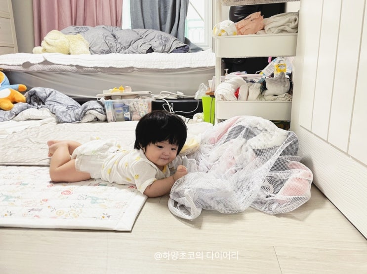 기동력이 생긴 후로 방 여기저기를 기어다니기 시작! ㅋㅋㅋ 날씨가 좋아서 빨래하려고 잠깐 방안으로 빨래...