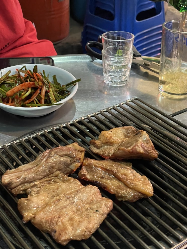 퇴근 후 저녁 겸 동네 야장 돼지갈비집 밖에서 먹으면 더 맛있는건 기분 탓이겠지? 2차는 파전, 감자전 반...