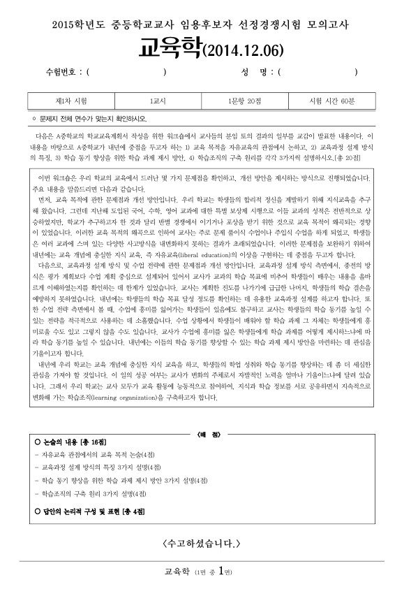 수요일 # G스쿨 인강 #구평회교육학 (3-6월) 기억<쏙> - 기출문제 풀이 10주차 2015 중등 기출문제...
