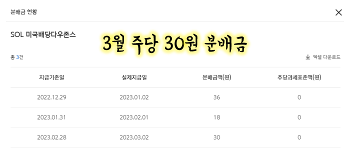 3월 SOL 미국배당다우존스 배당 기록, 월배당 55,650원