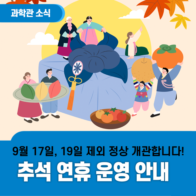 민족 최대의 명절 중 하나인 추석이 다가왔습니다.? 국립부산과학관은 추석 연휴 정상 개관합니다. 오늘...