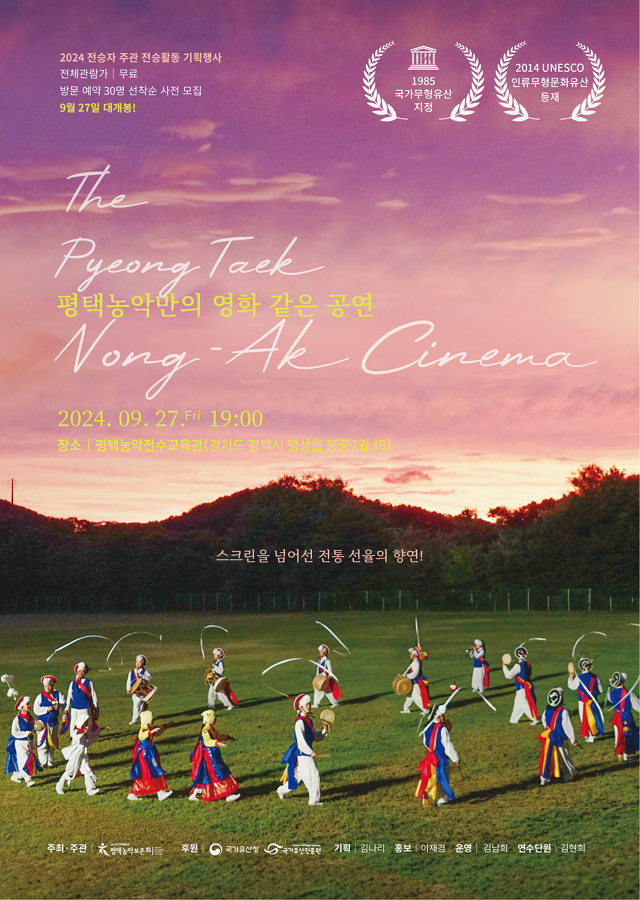 9월 27일(금) 저녁 7시, 영화처럼 즐기는 평택농악 공연 선사 유네스코 인류무형문화유산이자 국가무형유산...