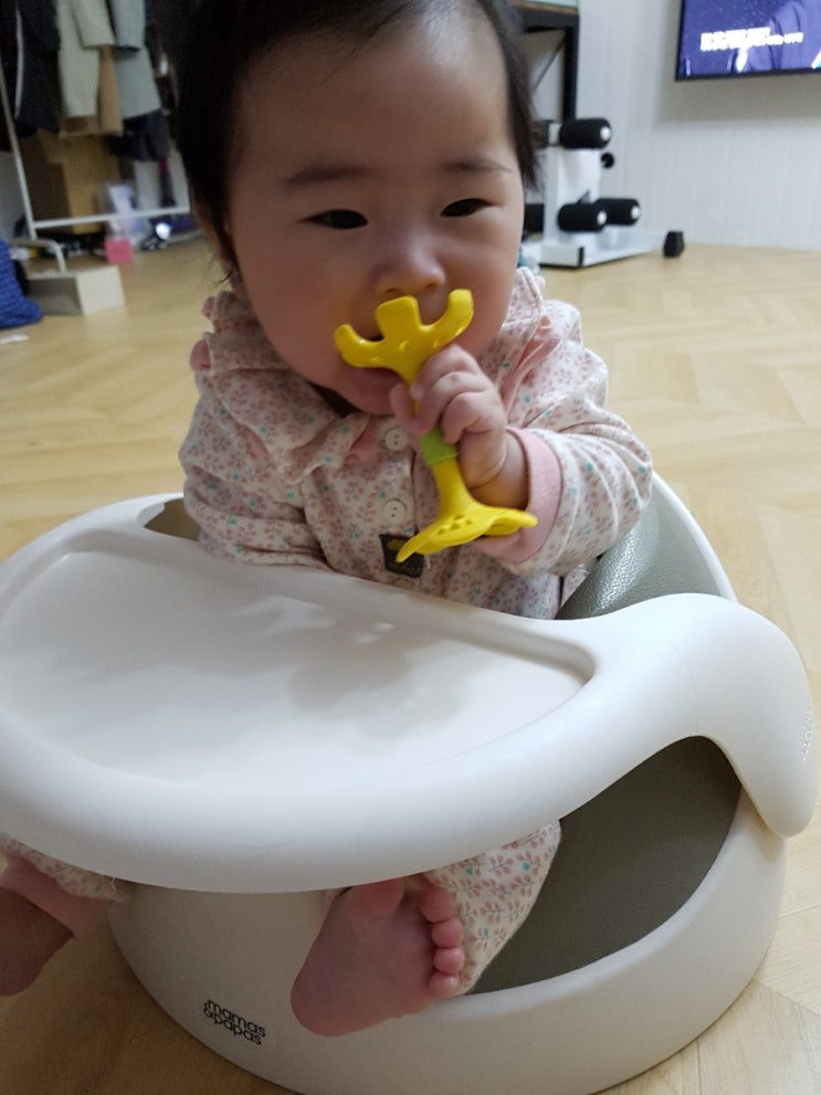 4개월쯤 손이 자꾸 입으로 가서 차발기를 샀는데 그때는 손으로 잡지도 못하고 입에 넣어줘도 싫어하더니 6...