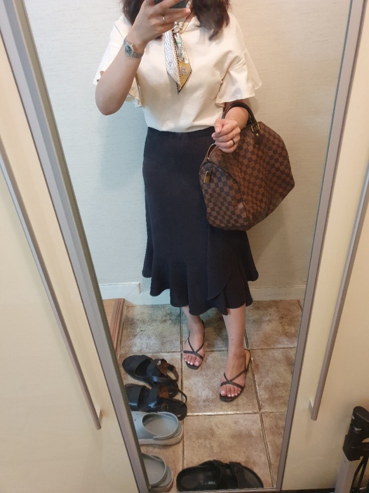 200903_sjsj 블라우스, 시스템 스커트, 세라 샌들, 루이비통 스피디 35, 디올 미챠
