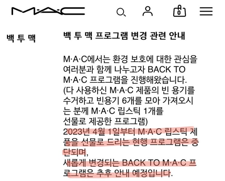 오늘 언니랑 화장품 정리하다가 깜놀해서 쓰는 정보 현재 맥에서 시행하고 있는 맥 자사 브랜드 제품의 공...