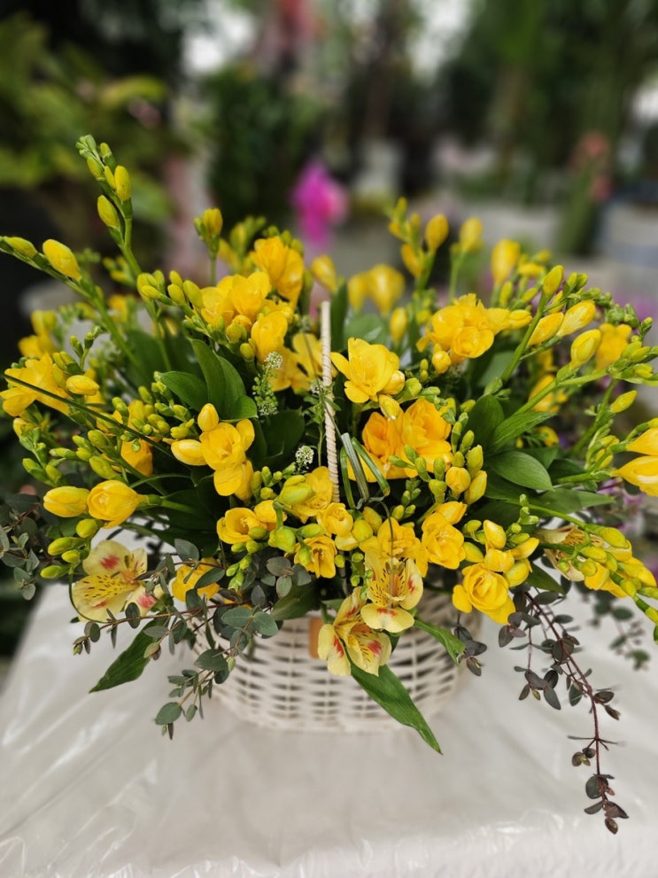후리지아 꽃바구니 주문이 있었습니다 봄 하면 후리지아꽃 다들 아시죠 ?! 노란 색에 반하고 꽃내음에 두번...