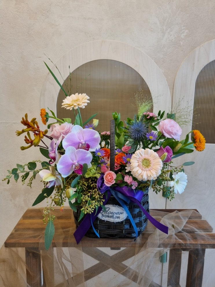 영전축하선물로 꽃바구니 대형사이즈 주문해주셨어요 서양난 포인트로 핑크와 은은한컬러감의 꽃으로 고급...