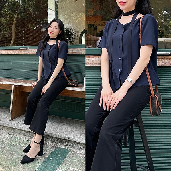 여자 여름 출근룩 녹섭 타이블라우스