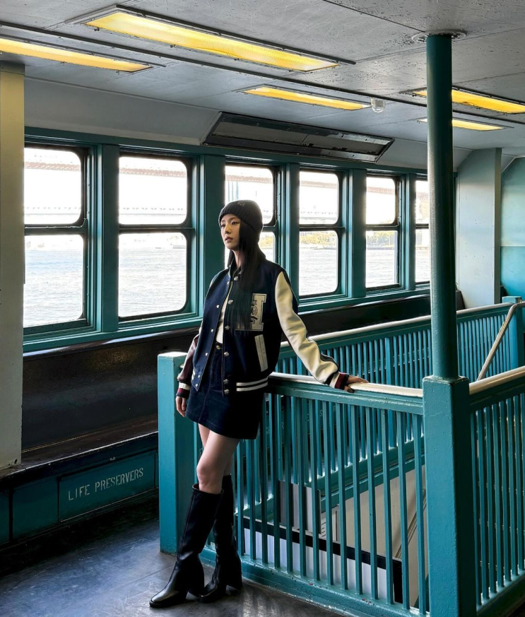 블랙핑크 지수 님이 타미힐피거의 바시티 자켓을 야구점퍼로 착용 하시면서 뉴욕의 대학생 룩을 선보여 주...