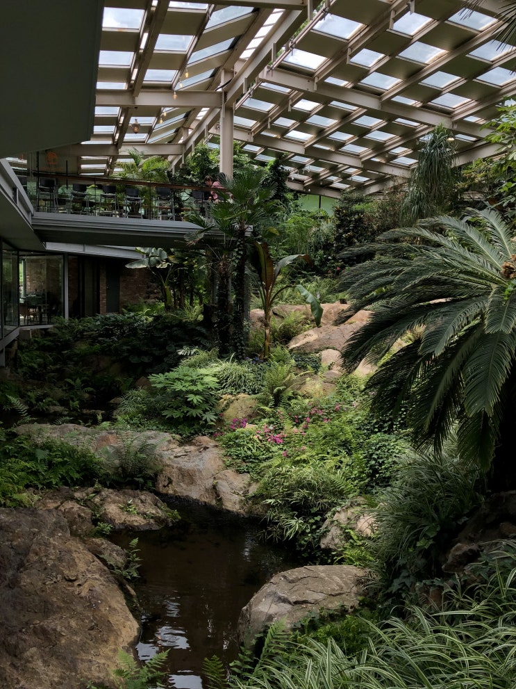 실내에 식물이 가득한 카페, 오랑주리. 마장호수가 보이긴 하는데 거의 끄트머리 부분이다. 좌석보다 식물...