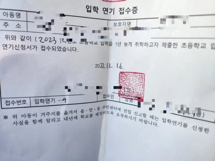 입학 연기 와 입학 유예. 이 두 가지가 다른 것이란다. 7세 때는 행정복지센터에서 입학연기 신청서를 작성...
