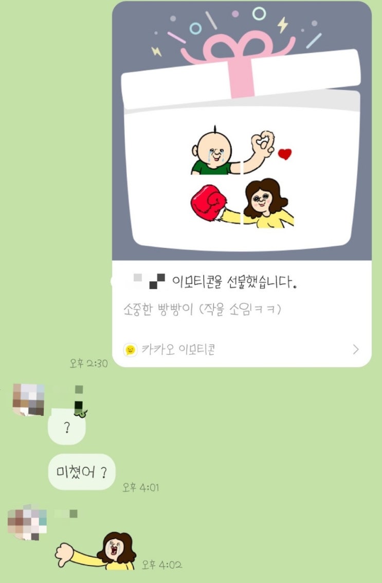 현실 자매의 흔한 대화. 언니가 이모티콘을 선물했는데, 돌아오는 동생의 대답이 미쳤어? 라니 ㅋㅋㅋㅋㅋ...