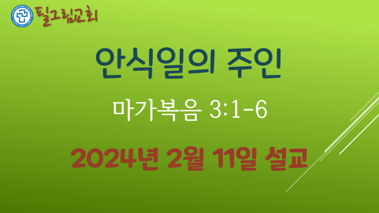 안식일의 주인 (마가복음 3:1-6) 44, 46장. 2024. 2. 11 필그림교회 주일예배 마가복음 시리즈 설교 첫 번...