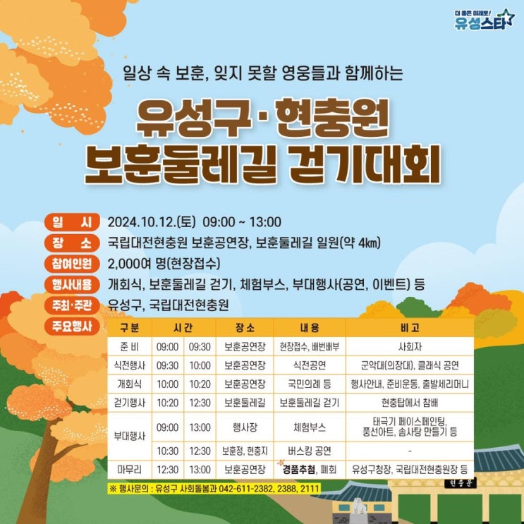 일상 속 보훈, 잊지 못할 영웅들과 함께하는 유성구• 현충원 보훈둘레길 걷기대회 일시 2024.10.12.(토) 0...