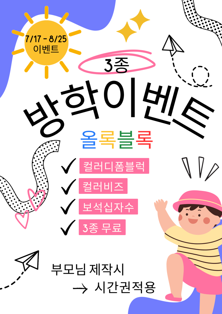 신규 레고와 디폼블럭, 컬러비즈, 보석십자수 3종을 모두 만나볼수 있어요. 7/17~8/25일까지 방학기간에는 ...