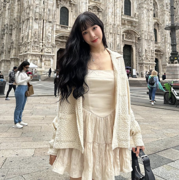 티파니 님이 모스키노와 함께 2024년 SS 시즌을 선보이면서 착용하신 크롭티 프린트 티셔츠는 그레이 컬...