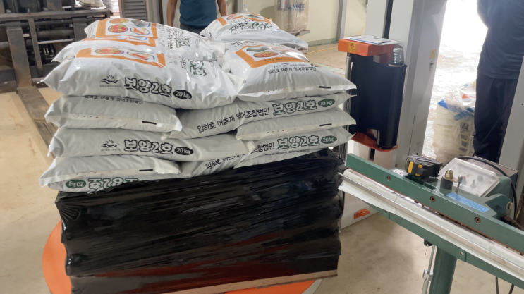 검정랩 포장하는 파렛트랩핑기, 랩핑기 색상감지센서 장착(임하호어촌계)