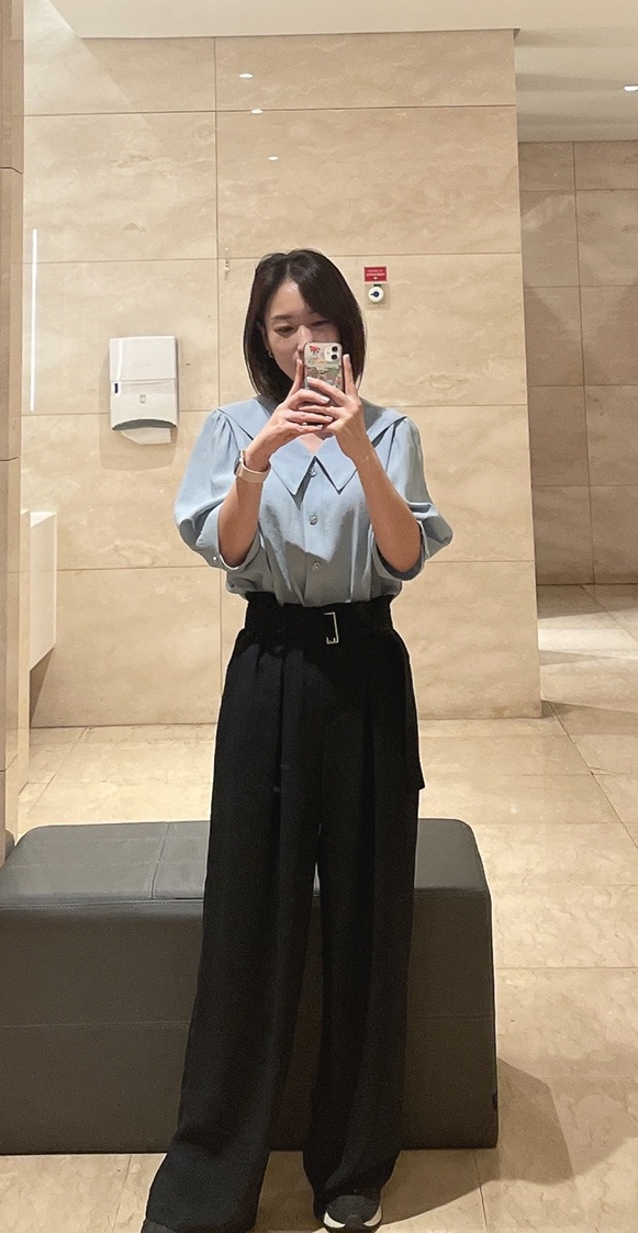 230621 ootd 출근룩 - 올리브데올리브 카라 포인트 블라우스 • 주크 벨티드 허리밴딩 핀턱 와이드 팬츠
