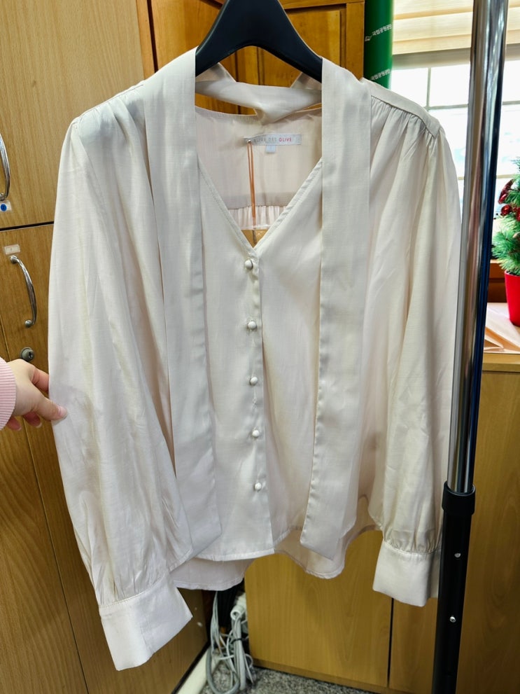 봄 블라우스 장만했어요>< 올리브데올리브 콩단추 타이 블라우스 OH3SB1470입니다. 제가 블라우...