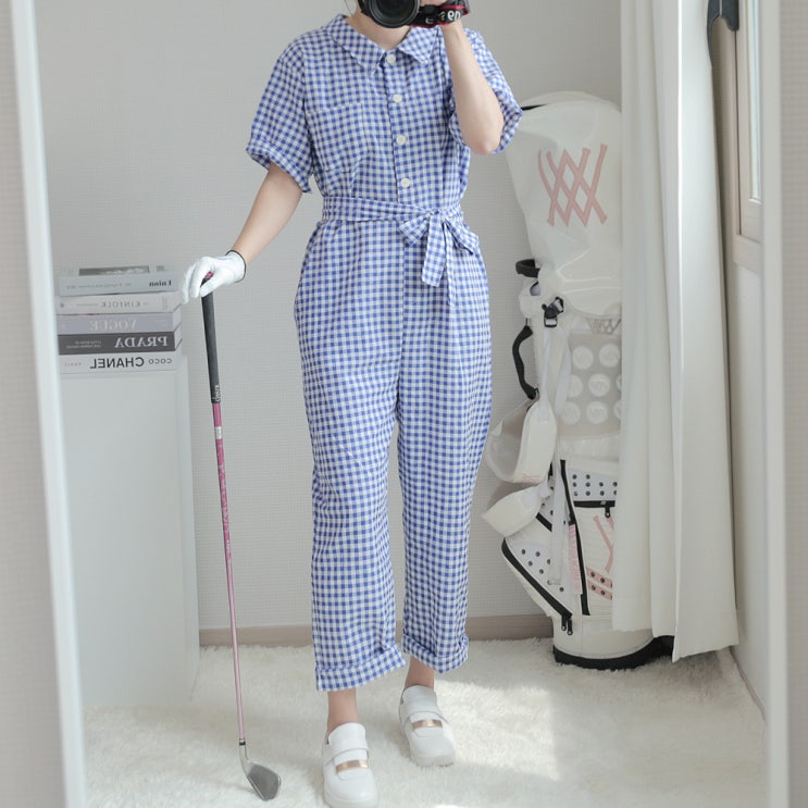 루즈핏 여성 골프웨어 여름 체크 점프수트 상하의 세트 연습복
