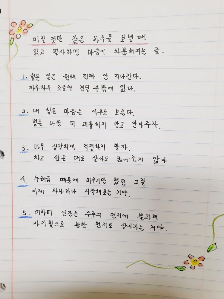 미칠 것만 같은 하루를 보낼 때 읽고 필사하면 마음이 차분해지는 글. 1. 힘든 일은 원래 진짜 안 지나간다...