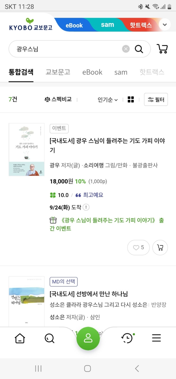 교보문고 책 저렴하게 구입하는 방법 입니다. 교보문고 어플로 구입할 도서를 검색 합니다. 광우스님이 들...