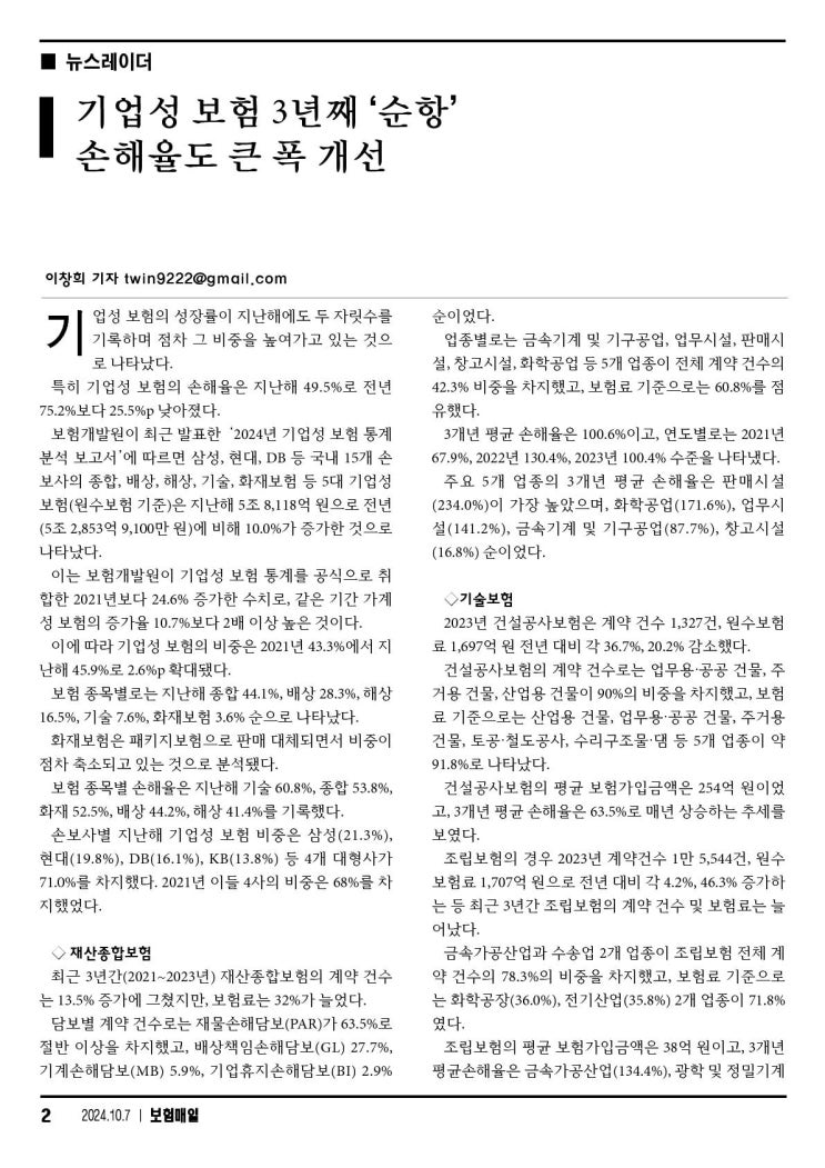 [인카 린치핀]보험 뉴스 2024년 10월 07일 월요일