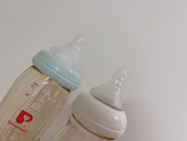 유미젖병, 더블하트젖병, 유미 추빨대, 더블하트 전용 추달린 스트로우, 하이비 2단계 추달린 빨대세트, 유미 젖꼭지 2,3단계, 더블하트 모유실감 젖꼭지 M,L(3,4)단계 비교