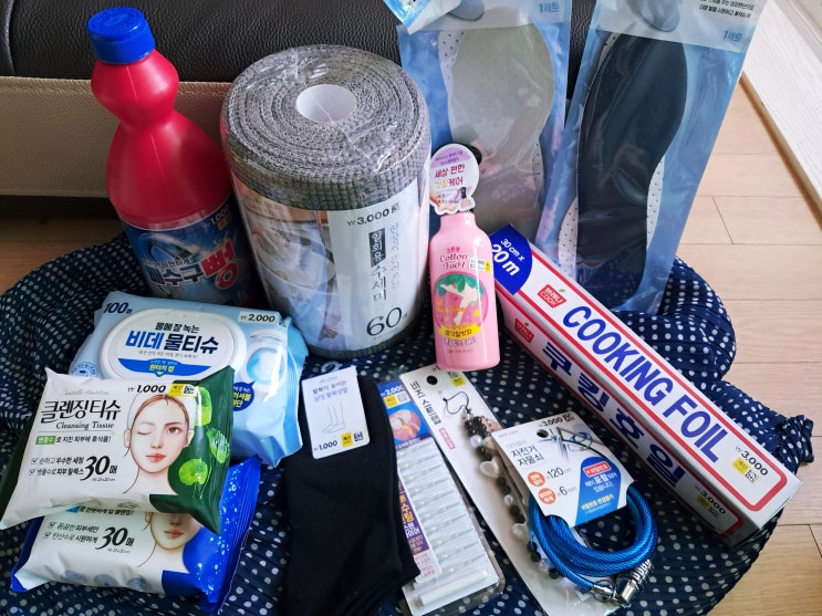 [#67] 다이소 쇼핑 ~ 일회용 수세미, 자전거 자물쇠, 비즈 스트랩, 발목 양말과 쟁여두는 품목 등