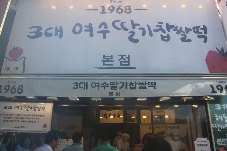 호텔서 나온 우리는 인근 3대 여수딸기 찹쌀떡집에 차를 대고 떡을 구입. 여기 파는 물품들. 구입한 떡. 먹...