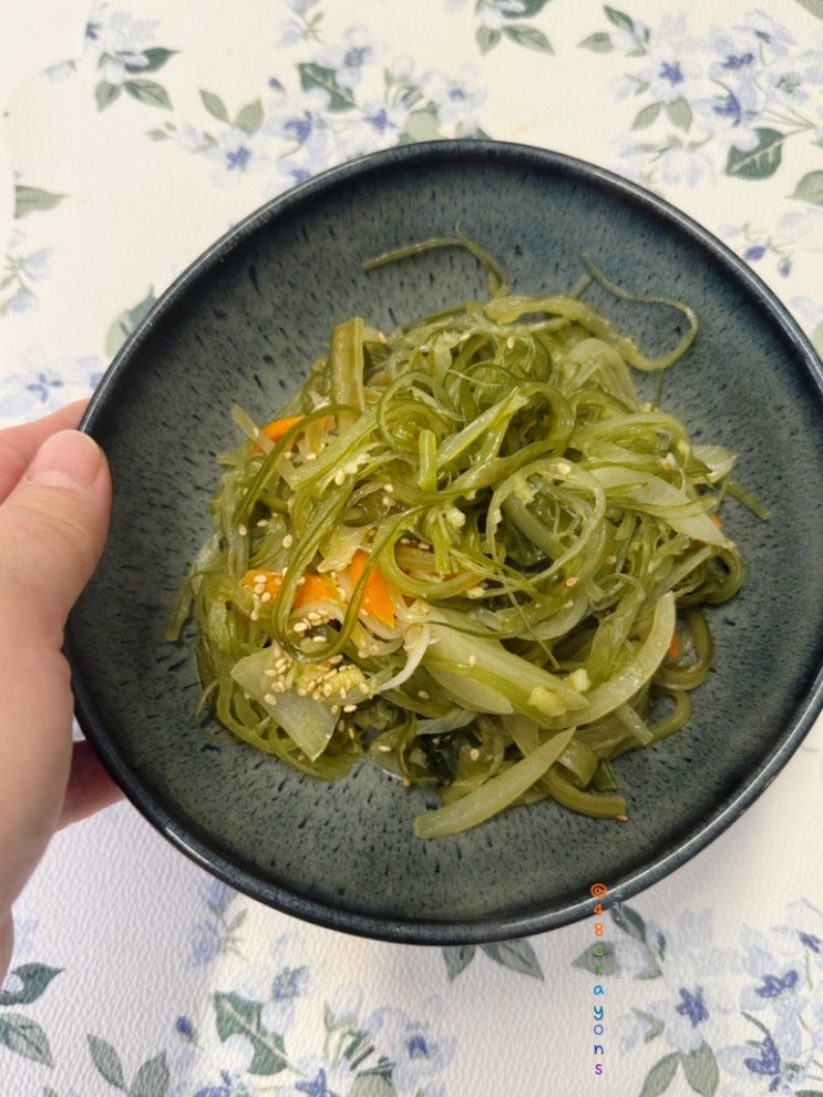 48크레용의 실패 없는 #미역줄기볶음만들기 미역줄기 볶음은 염장 미역줄기를 구입해 짠 기를 뺀 후 국간장...