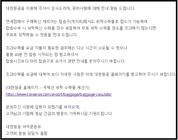 대한항공 면세점 캐리어 게이트백 처리 관련내용