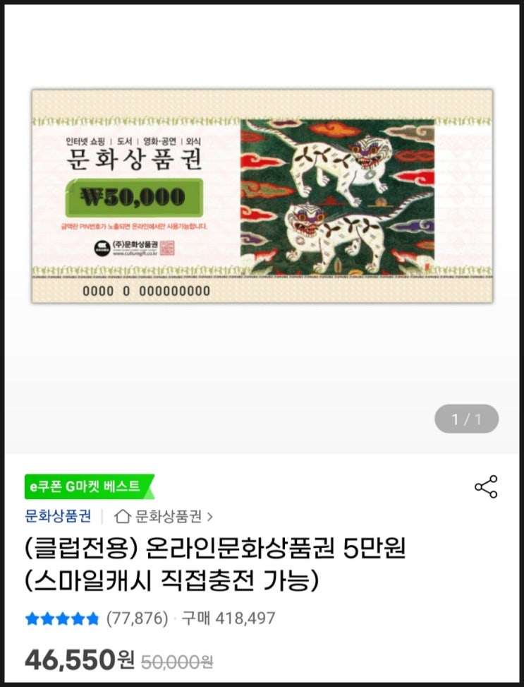 지마켓 문화상품권5만원46,550원(6.9%)판매