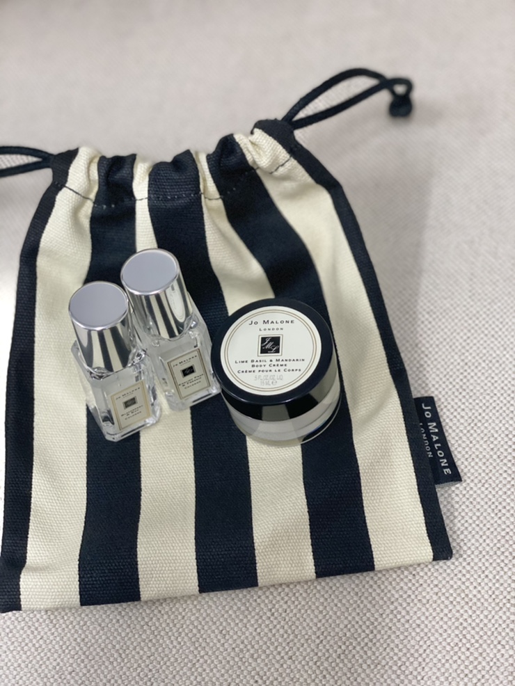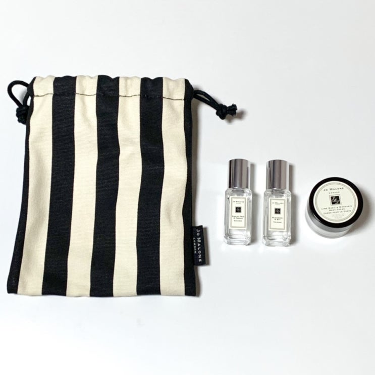 조말론 센트페어링 트리오 구성품은 파우치, 향수2개, 바디크림 아주 앙증맞은 미니사이즈다. ? 잉글리...