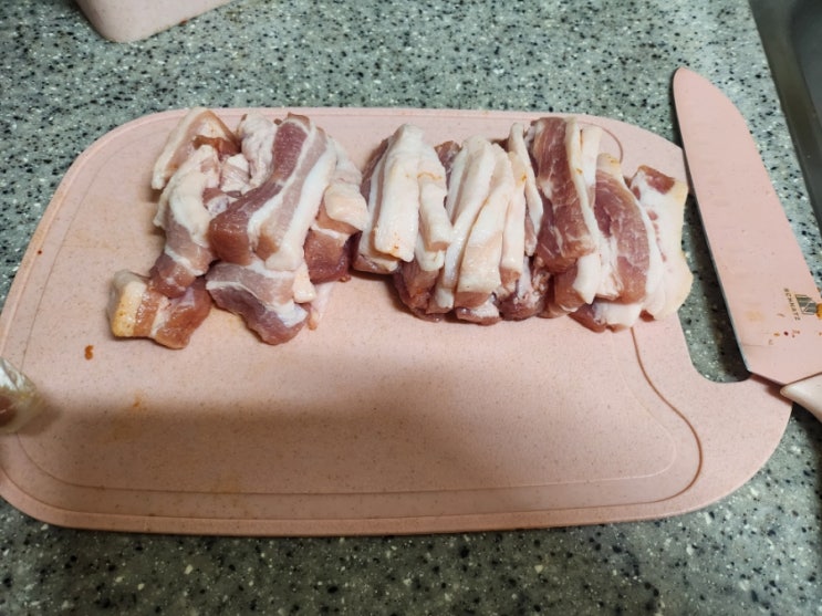 돼지고기 숭덩숭덩 잘라준다 가이타이너 올인팟 압력 쿠커에 반은 묵은지를 반은 썰은 돼지고기를 담는다 ...