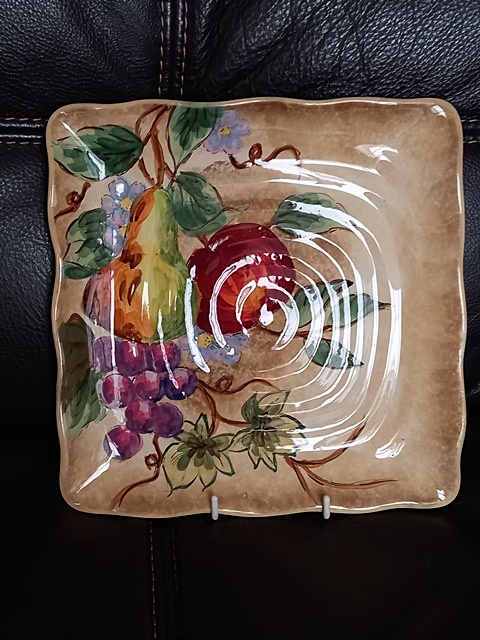 멋지고 풍성한 과일이 핸드페인팅된 접시 입니다. 포세린에 과일 정물화를 그려 놓은듯 멋스러워요. 꽃부분...