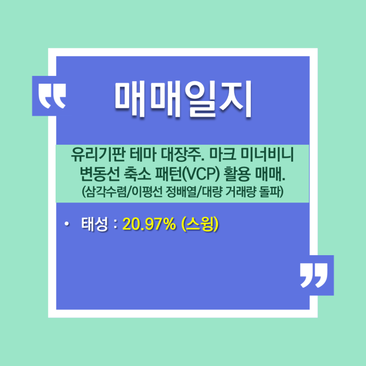 [매매일지] 유리기판 테마 대장주. 마크 미너비니 변동성축소패턴(VCP) 활용 매매 (feat. 태성 / 삼각수렴 / 이평선 정배열 / 대량 거래량 돌파 / 복합동박)