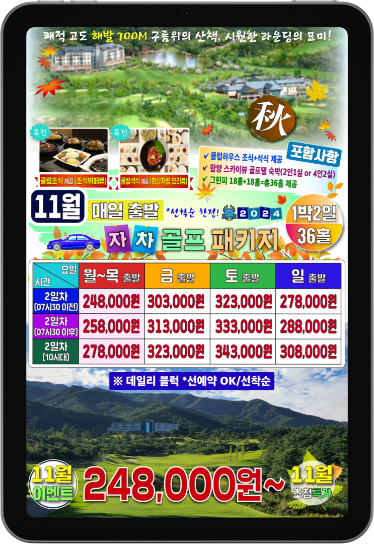 11월 1박2일 골프패키지 11월은 시간대 별로 예약이 가능합니다. 포함사항 안내 그린피 36홀 골프텔 2인실 ...