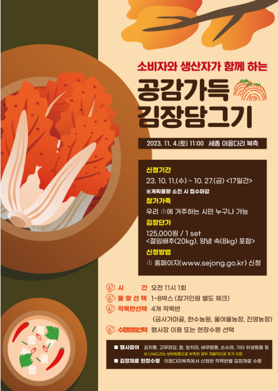 제10회 우리 농산물 김장 담그기 행사 신청 10월 14일부터 가능해요. [행사 내용] ◆ 개요 ▶ 행사 일정: 2...