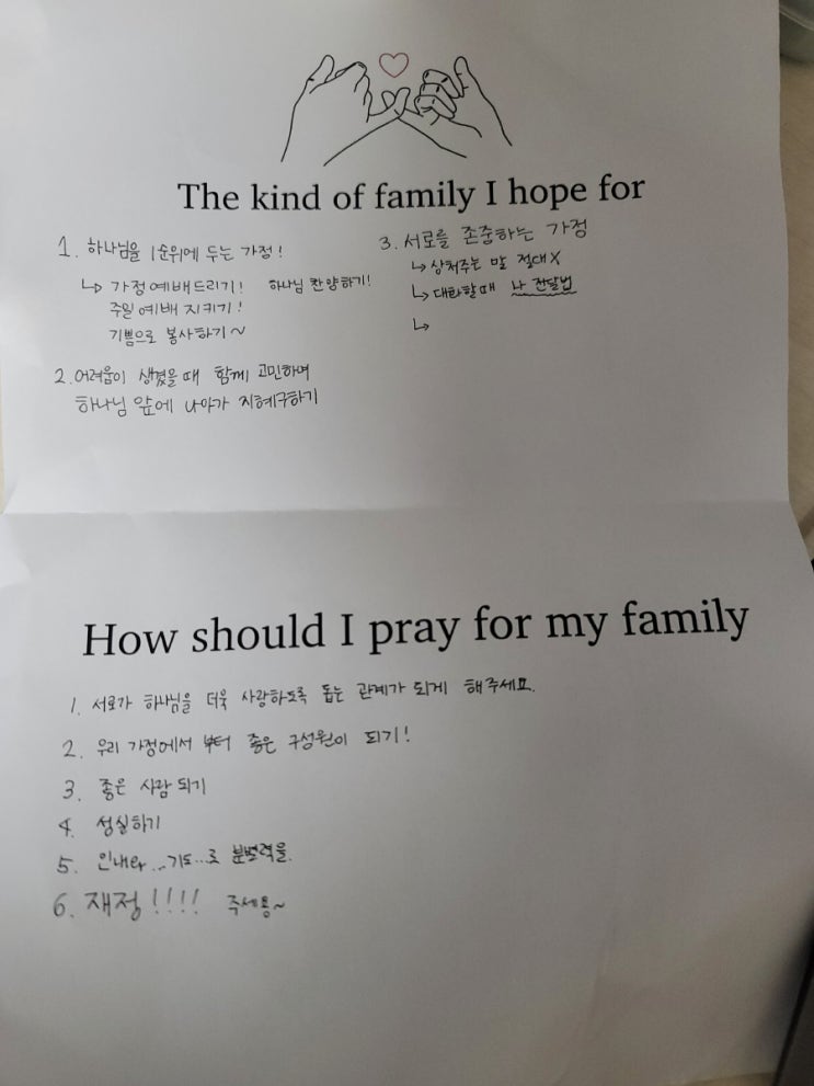 오늘 4W 말씀이 부모와 자녀가 순종하라는 말씀이길래 현재 가정을 돌아보고, 미래 가정을 소망하는 활동...