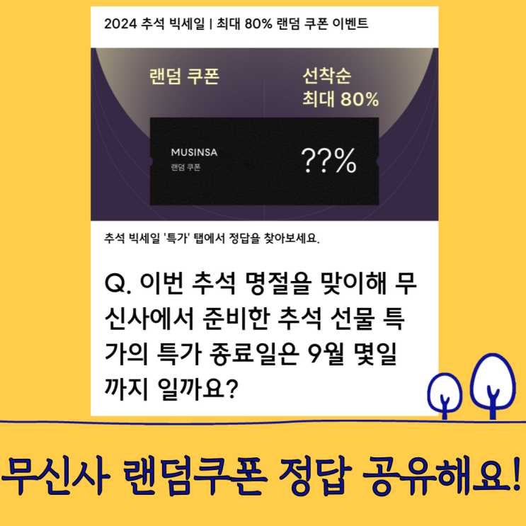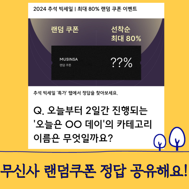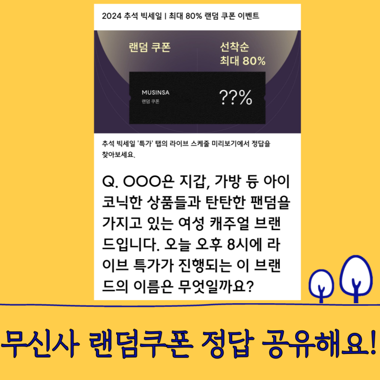설렌이에요 :) 오늘도 돌아온 무신사 랜덤퀴즈 타임!!! ( 2024 추석 빅세일 행사를 맞이하여 진행하는 랜덤...
