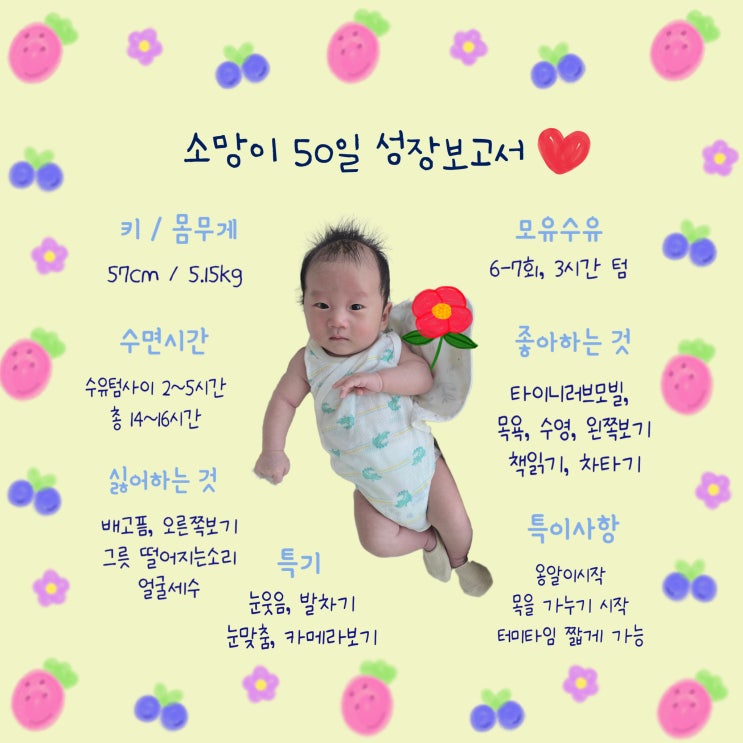 50일 아기 성장보고서 (모유수유 수유텀 터미타임 옹알이 수영 시작)