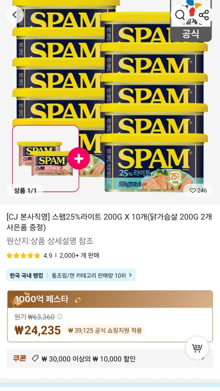 [알리] 스팸라이트 200g×20개+닭가슴살 스팸×4 33470원 (개당 1400원) 꽤 저렴...!!! 1.5만 쿠폰 받기 후 2...