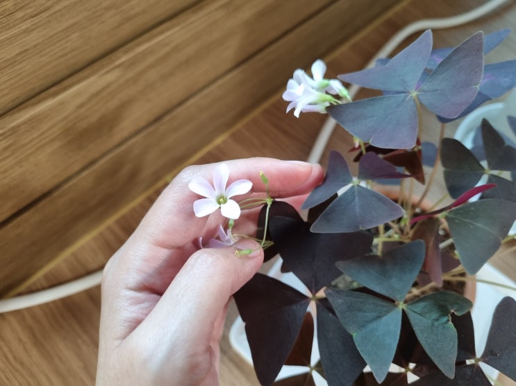 용인 처인구 남사 화훼단지에서 사온 자주 사랑초. 해가지면 잎이 오므라들고 밝아지면 잎이 펴지는 신기하...