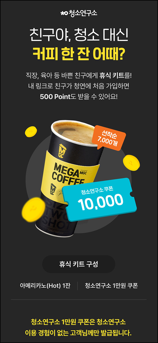 (종료)청소연구소 신규가입 메가커피 기프티콘 7,000명 즉시지급 선착순