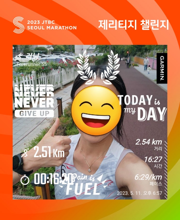 김해숲길마라톤대회 D-38, JTBC 서울마라톤 D-178, 달리기 연습 50일째, 총 5.4km 능동공원 옆 산책로, '제리티지 챌린지' 완료!