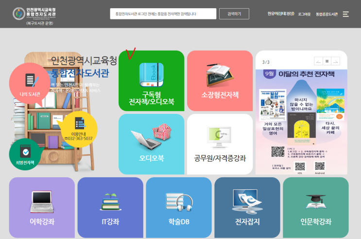 인천광역시 교육청 통합 전자도서관 이용 방법 PC버전._버튼이 너무...작...아..요...! 구독서비스안내 ...