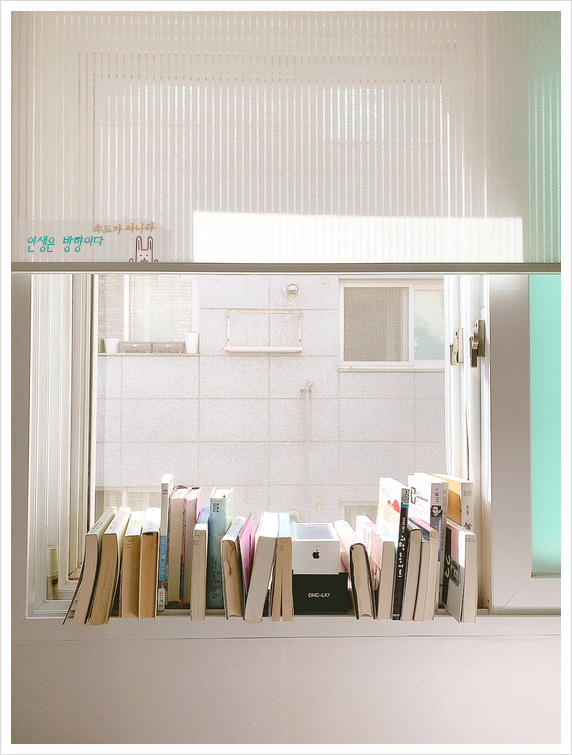 책들은 일광욕 중. 창틀에 쪼르륵 앉아 가을 햇살에 적당히 익어가고(?) 있다. 크림색 필터가 들어가니 굉...