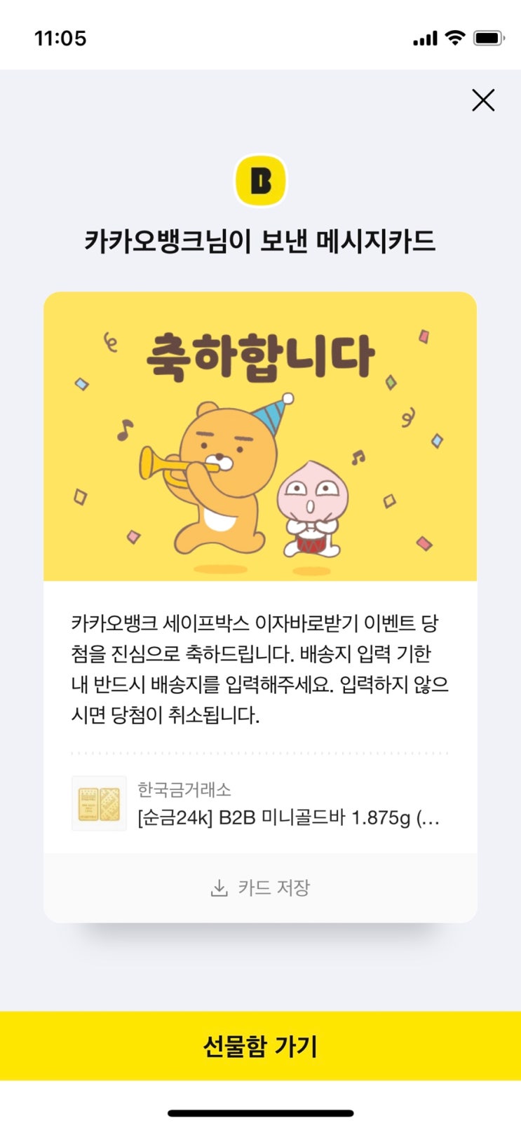 카카오뱅크 세이프박스 이자받기 이벤트 당첨됐어요! 반돈~ 금이라니:)